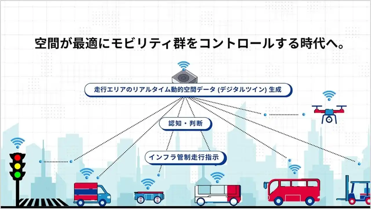高精度デジタルツインに基づくインフラ管制方式で、複数台のモビリティが混在する環境下でも安全かつ効率的に自動走行ができる実現性を検証します。 |