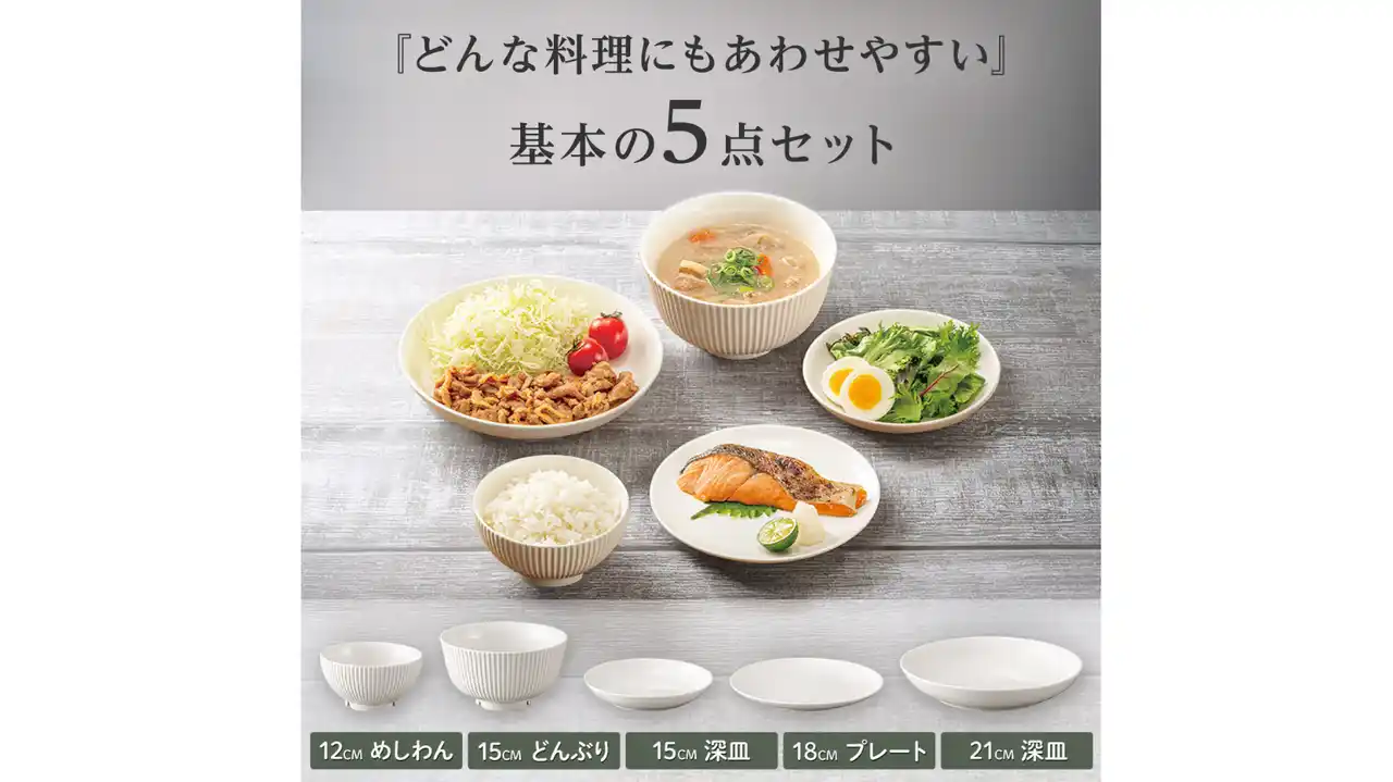 そこでニトリは、主菜・副菜・汁物など、家庭の定番メニューに合わせやすいシンプルな「食器5点セット」の販売を開始しました。 |