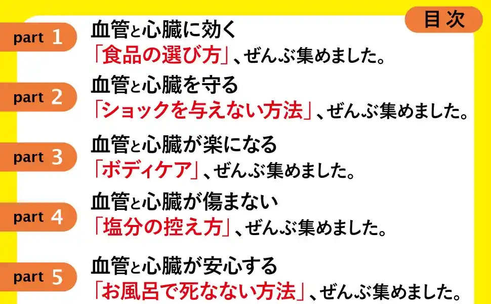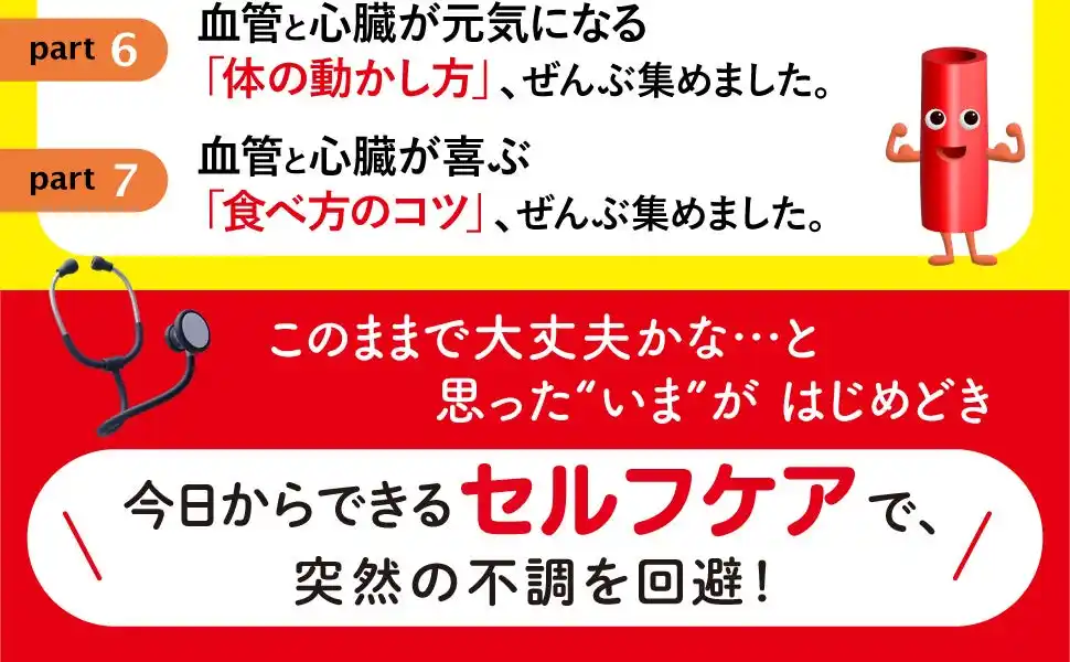 ……など高血圧、動脈硬化、コレステロール、中性脂肪といった健診結果が気になる項目に直結する、血管と心臓を健やかに保つための習慣を多角的に紹介します。 |