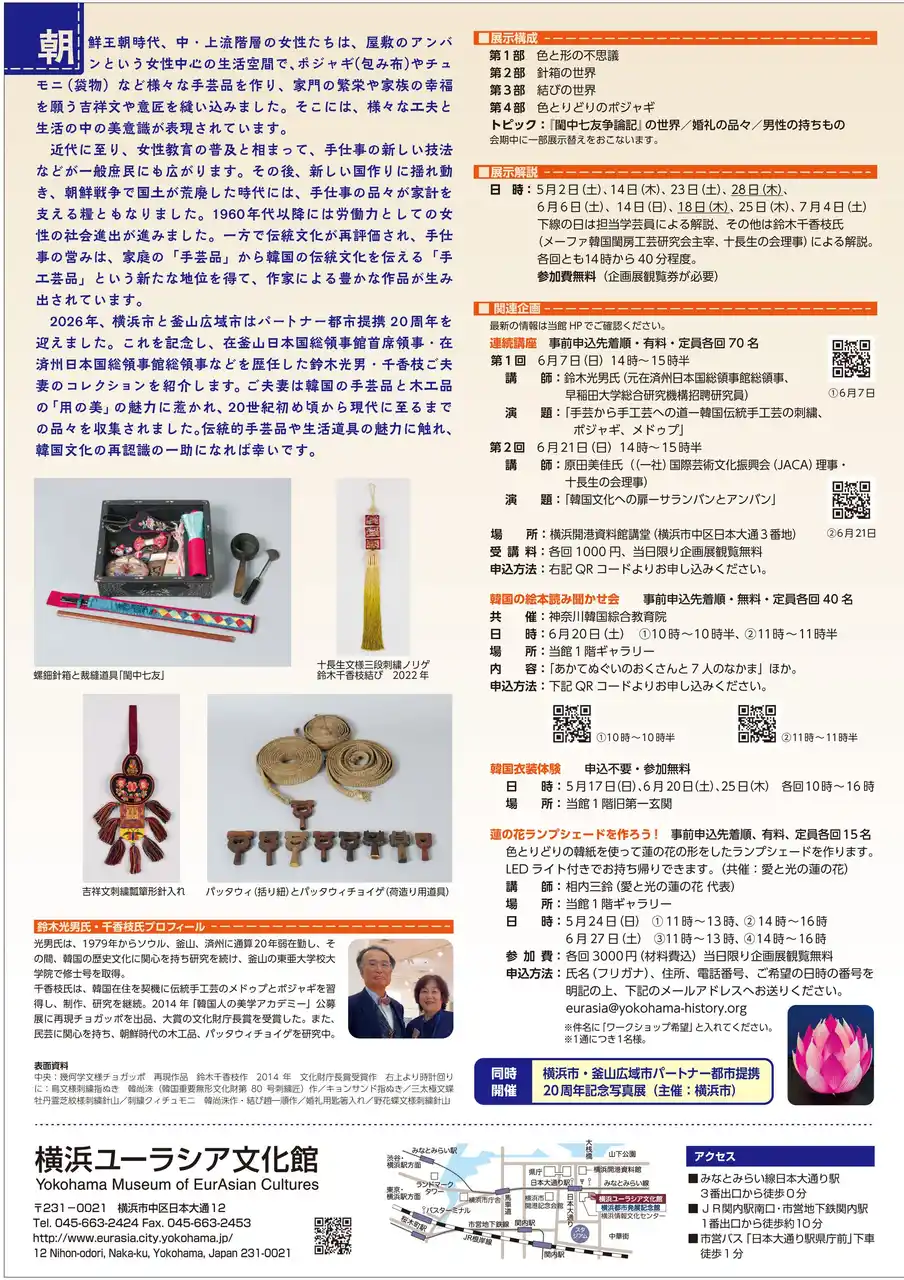 | 2026年、横浜市と釜山広域市はパートナー都市提携20周年を迎えました。これを記念し、在釜山日本国総領事館首席領事・在済州日本国総領事館総領事などを歴任した鈴木光男・千香枝ご夫妻のコレクションを紹介します。ご夫妻は韓国の手芸品と木工品の「用の美」の魅力に惹かれ、20世紀初め頃から現代に至るまでの品々を収集されました。伝統的手芸品や生活道具の魅力に触れ、韓国文化の再認識の一助になれば幸いです。 | ||||||||||||||||