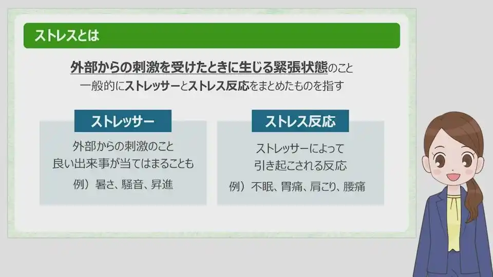 このような背景を踏まえ、リスクモンスターでは社会人のストレス対処力を高めるeラーニングを開発しました。本コースは臨床心理士および心理カウンセラー監修のもと制作されています。アニメーション形式で視聴しやすく、修了試験も備えているので、学習内容を実務に活かしやすい構成となっています。 |