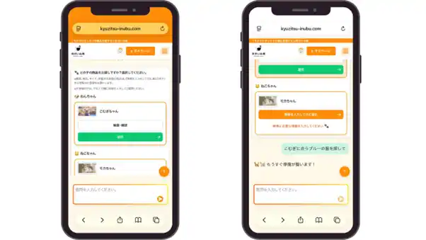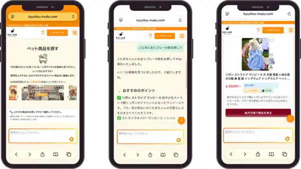 | ペットの種類(犬・猫)、年齢、体重、性別、そして「お悩みや欲しいもの」(例:おでかけ用の服、歯石ケアなど)に関する質問に答えるだけで、膨大な商品の中から、お客様のニーズに最もマッチしたペット商品をAIが厳選して提案します。 | |||