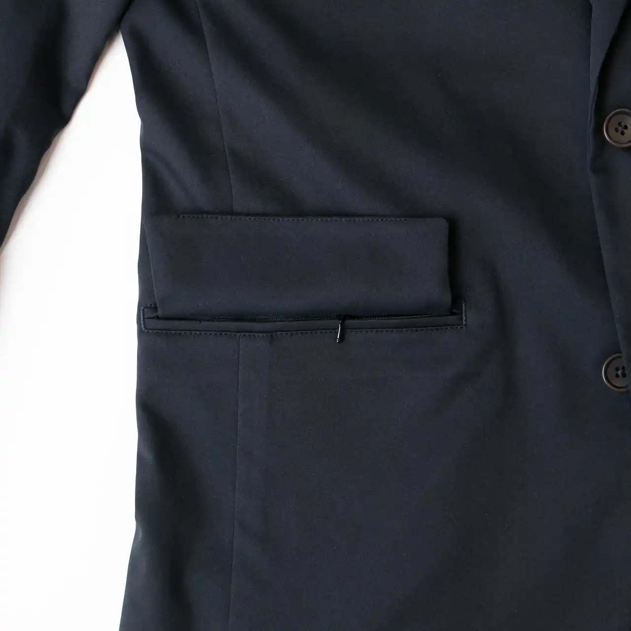 個人情報や鍵などを持ち歩くことが多いため、ジャケットには計7つのポケットを用意し、胸ポケットを除き全てファスナー付き。内ポケットは左に3つ、右に1つ用意し、教務帳や修学旅行のしおりを収納できるA5サイズほどの大容量ポケットや眼鏡収納ポケットを備えています。また、袖をまくりやすいようボタンが取り外せる本切羽仕様となっています。 |