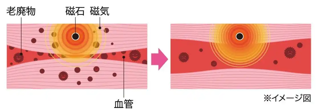 磁気が体内成分に働きかけて筋肉内の血行を良くし、老廃物を流すことでこりをほぐします。磁気は、着けた瞬間からコリのある部分に作用し始めます。ヒリヒリ感やひんやり感といった皮膚への刺激はありません。刺激を感じることと効きめとは異なります。 |