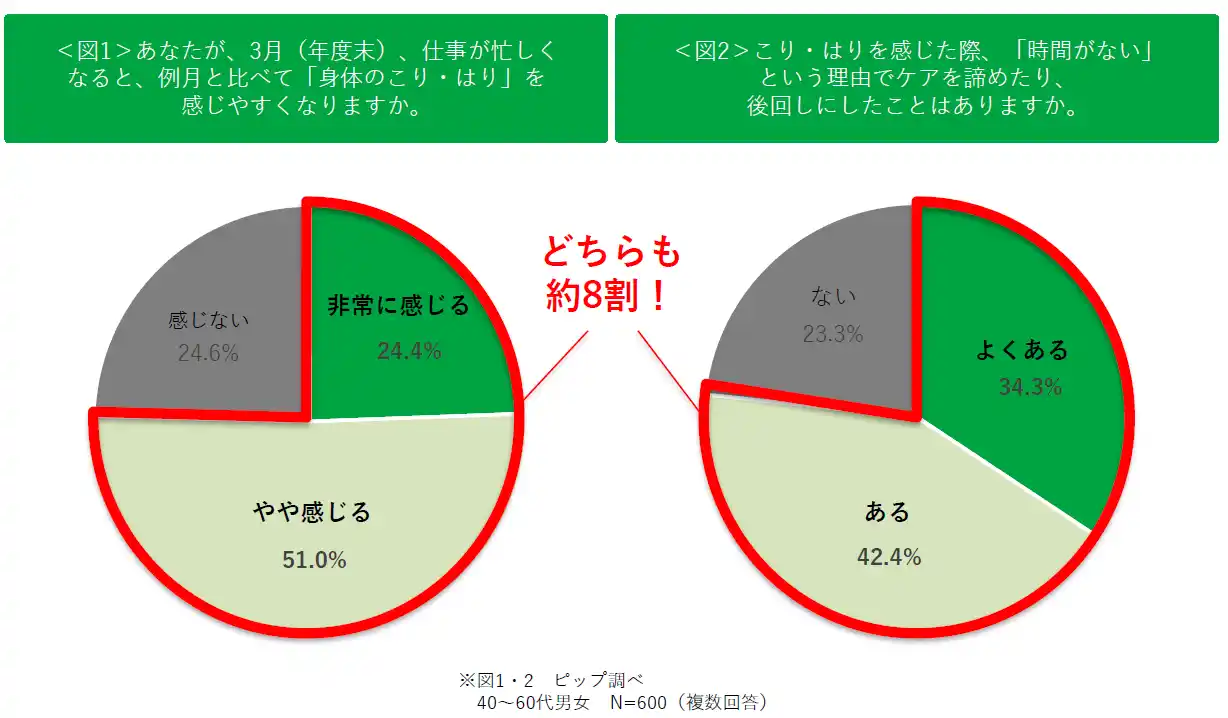 3月(年度末)は例月よりも約8割が「身体のこり・はり」を実感。ケアを諦めたり後回しの人も約8割! |