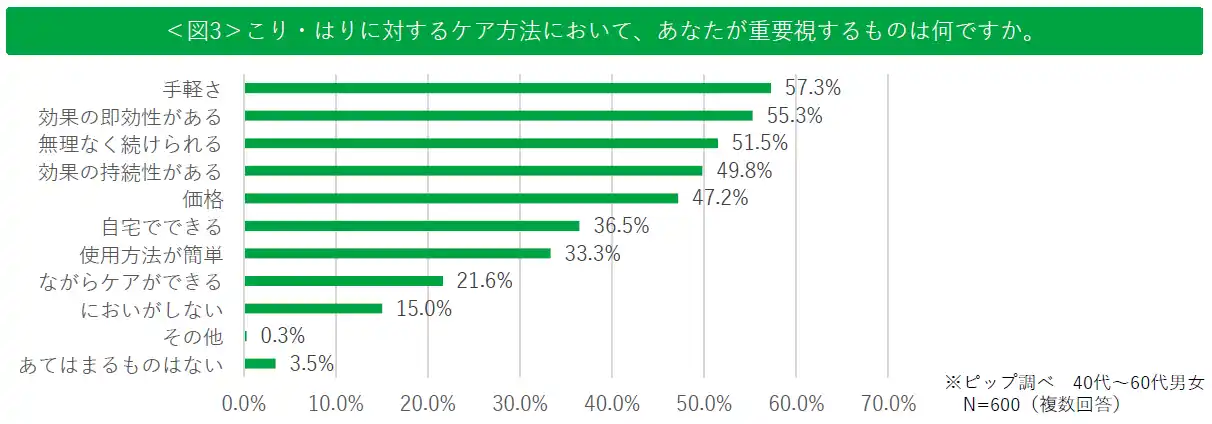 ・こり・はりに対するケア方法において、「手軽さ(57.3%)」「効果の即効性(55.3%)」