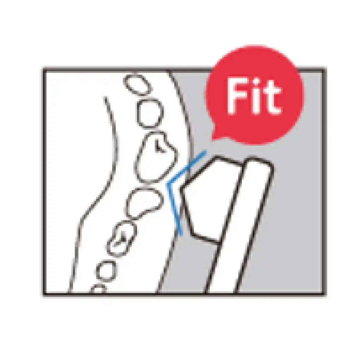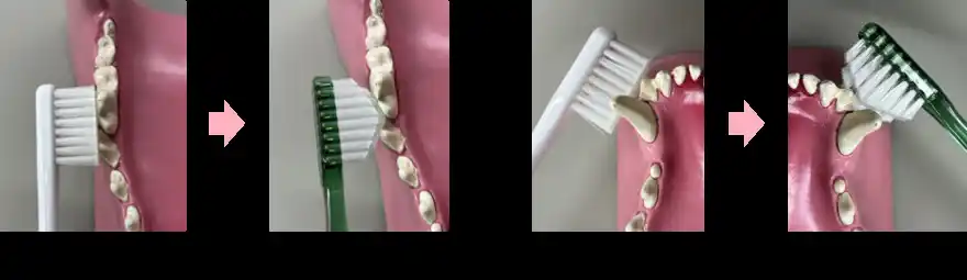 | ブラシを2段に分けることにより、歯の表面だけでなく、すき間や溝に当てるだけでフィットし、歯の表面とすき間のブラッシングを同時に可能に。 | ||||||||||||||