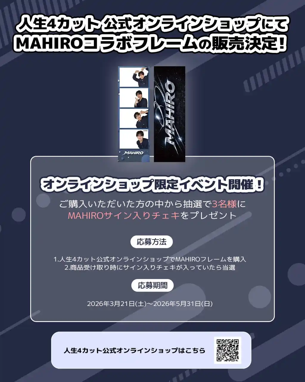 MAHIROと「人生4カット」のコラボレーションを記念して、ここでしか手に入らない豪華プレゼントが当たるSNSキャンペーンを開催いたします。 キャンペーンでは、MAHIRO直筆サイン入りチェキや直筆サイン入り人生4カットフレームを抽選でプレゼント!MAHIROコラボフレームで撮影した写真を投稿するだけで簡単に参加できるチャンス。 ぜひこの機会に、MAHIROとの特別な思い出をゲットしてください。 |