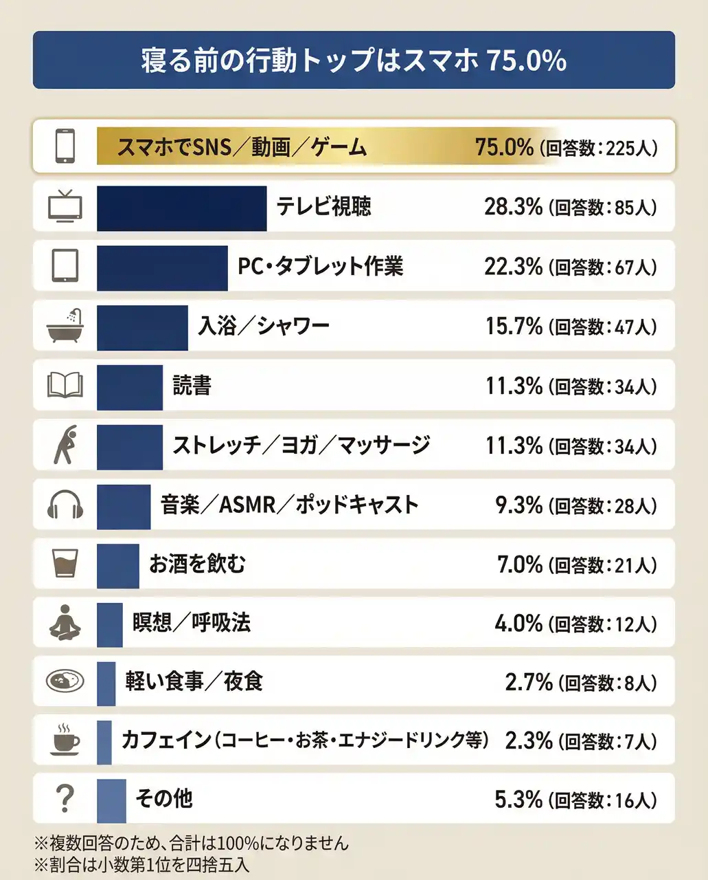 | また、寝る前の過ごし方ではスマホでSNS/動画/ゲームが75.0%(225人)と突出。理想の睡眠時間は7~8時間が最多で、現実とのズレが浮き彫りになっています。 | |||