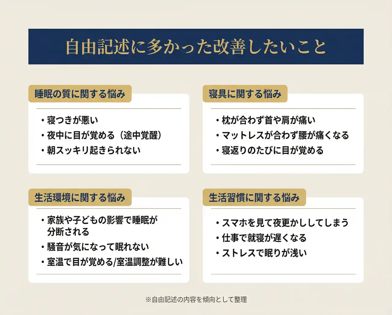 | これらの声から浮かび上がるのは、睡眠の問題が単純な時間不足ではなく、質、寝具、環境、生活習慣の複合的な要因から成り立っていることです。 | |||