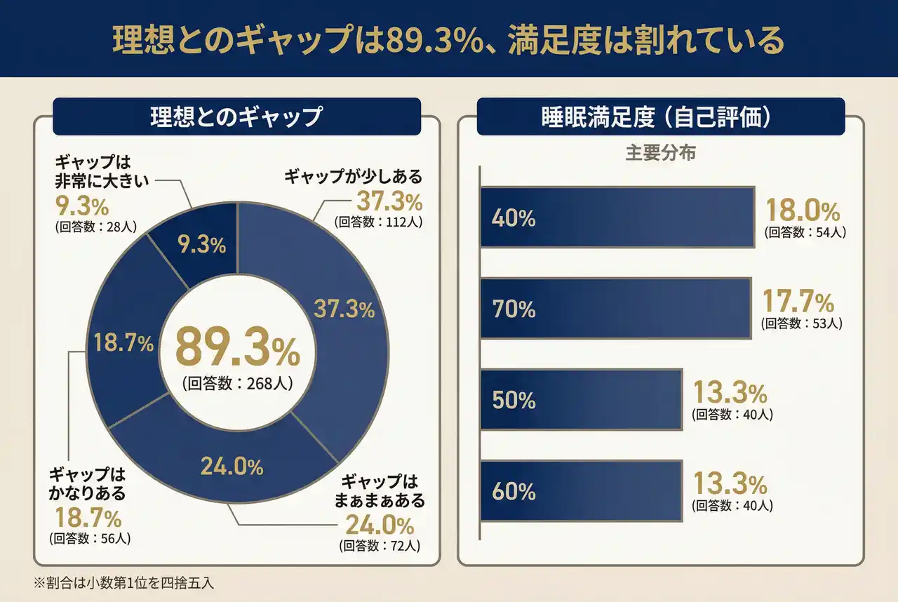 | 理想の睡眠とのギャップについては、ギャップが少しある37.3%(112人)、ギャップはまぁまぁある24.0%(72人)、ギャップはかなりある18.7%(56人)、ギャップは非常に大きい9.3%(28人)で、合計89.3%(268人)が何らかのギャップを実感していました。 | |||