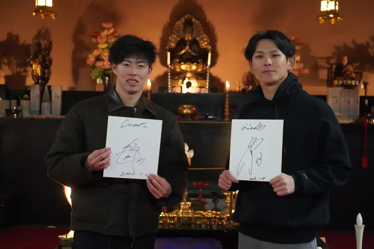 東京都西多摩郡檜原村に位置する「臼杵山 天光寺(住職:高尾聖賢)」は、東京都奥座敷年間10,000人が訪れる寺院です。この度、読売ジャイアンツの森田駿哉投手と泉圭輔投手が、今シーズンへの決意を胸に当寺で実施した「滝修行」の様子が、報知新聞創刊50周年記念号「月刊ジャイアンツ4月号」にて詳しく紹介されました。 |