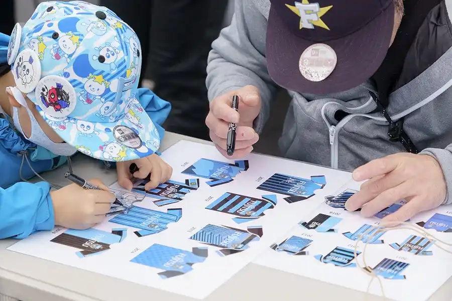 本企画では、2024年に川崎市制100周年を記念して掲出されたターポリン製バナーを破棄せず、ファン参加型のワークショップで”ボンフィン(リボン型チャーム)”として再生します。参加者は、チームロゴやキャラクターが印刷されたボンフィンに、自身の好みの色や柄を自由に加え、世界にひとつだけの応援アイテムを制作できます。裏面には当時の100周年事業で使用されていたデザインがそのまま残されており、カット位置によってすべて異なる表情を持つ“一点物”として楽しめることも大きな魅力です。 |