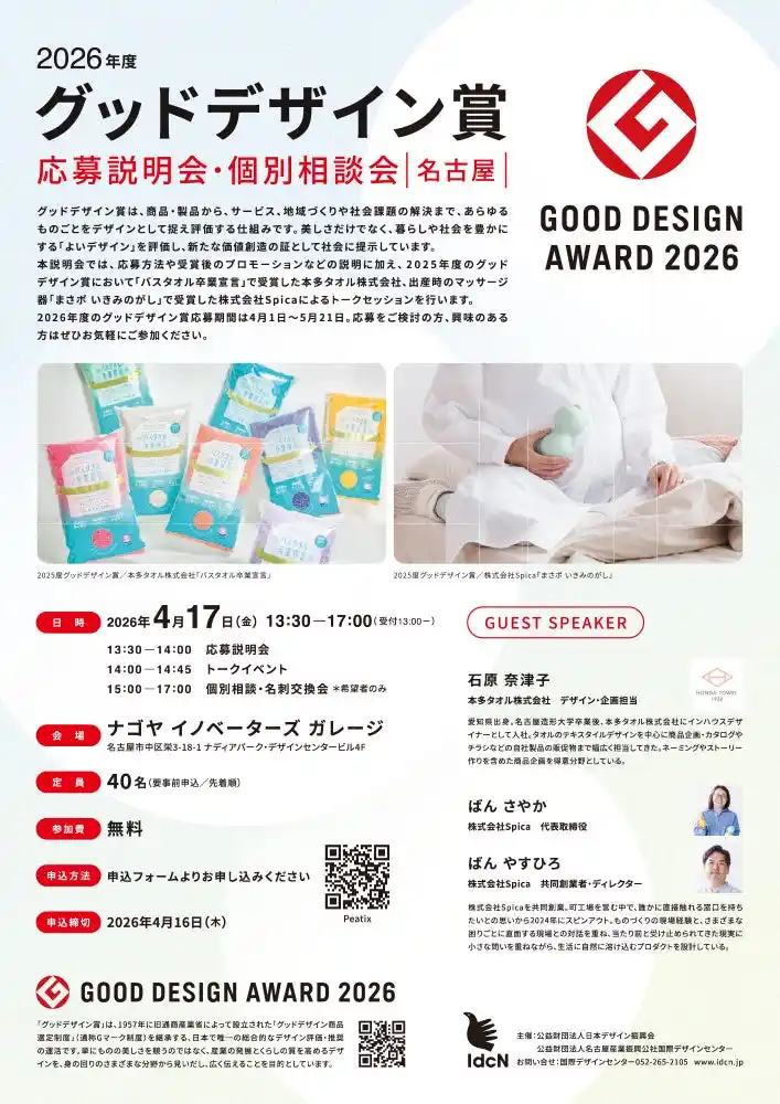 | 本説明会では、応募方法や受賞後のプロモーションなどの説明に加え、2025年度のグッドデザイン賞において「バスタオル卒業宣言」で受賞した本多タオル株式会社、出産時のマッサージ器「まさポ いきみのがし」で受賞した株式会社Spicaによるトークセッションを行います。 | ||||||||||