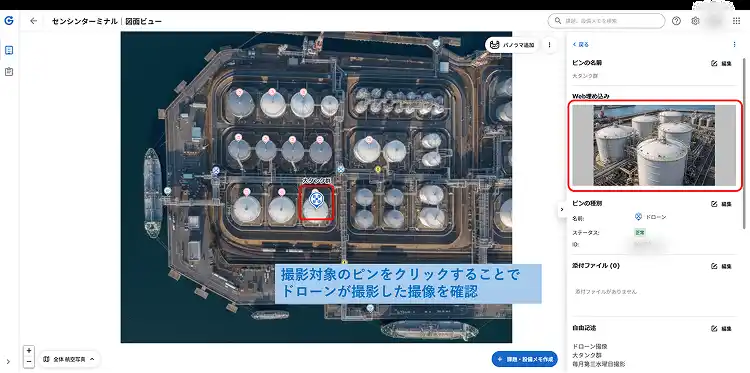 | ドローンが取得したデータとの連携も可能です。データ管理機能を持つセンシンロボティクス独自のアプリケーション『SENSYN CORE Datastore』との連携で、ドローンが撮影した画像を『ゲンコネ』上のピンから直接確認することができます。 | |||