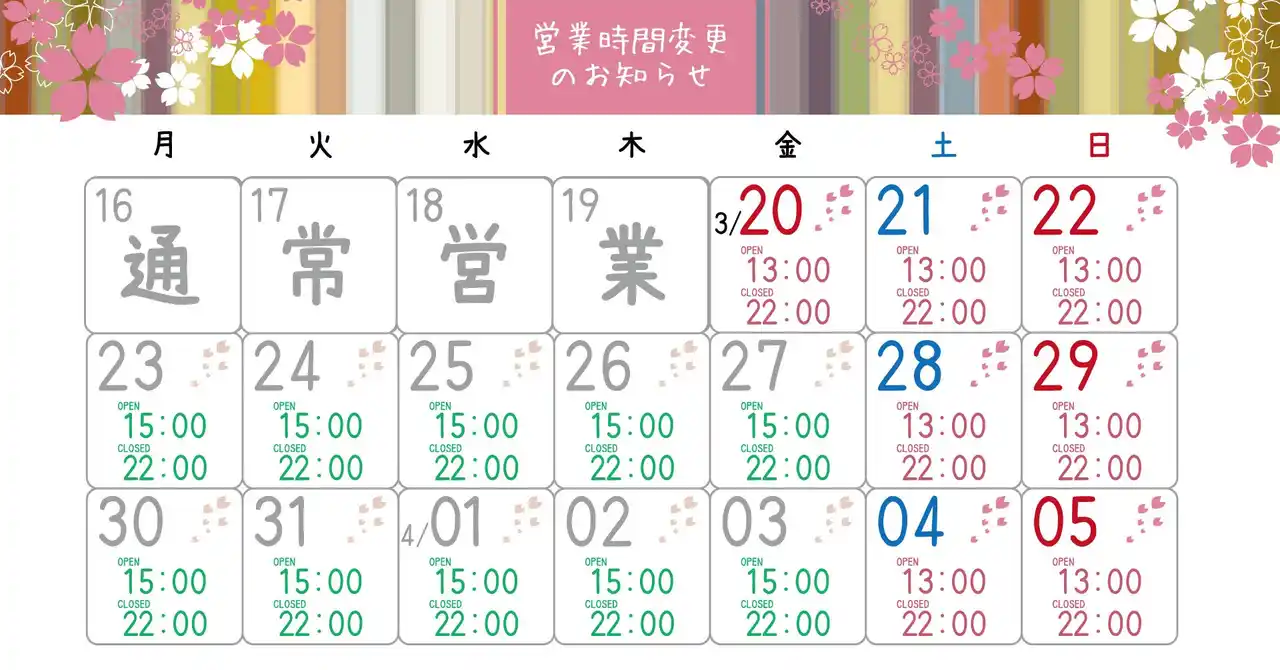 お花見期間中の営業時間:2026年3月20日(金)~4月5日(日) 土日祝:13:00~22:00 平日:15:00~22:00 通常営業時間:17:00~24:00 |