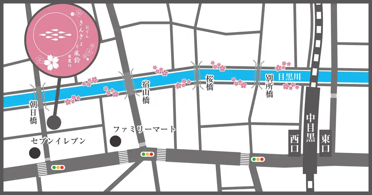 | ”おでん きんぎょと風鈴 目黒川”は、目黒川に架かる「朝日橋」から山手通り側に一本入った中道にございます。お花見の合間にぜひお立ち寄りください。 | |||||||||||||||