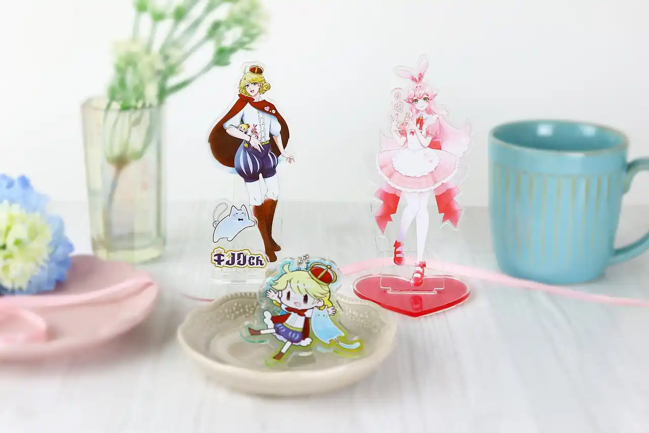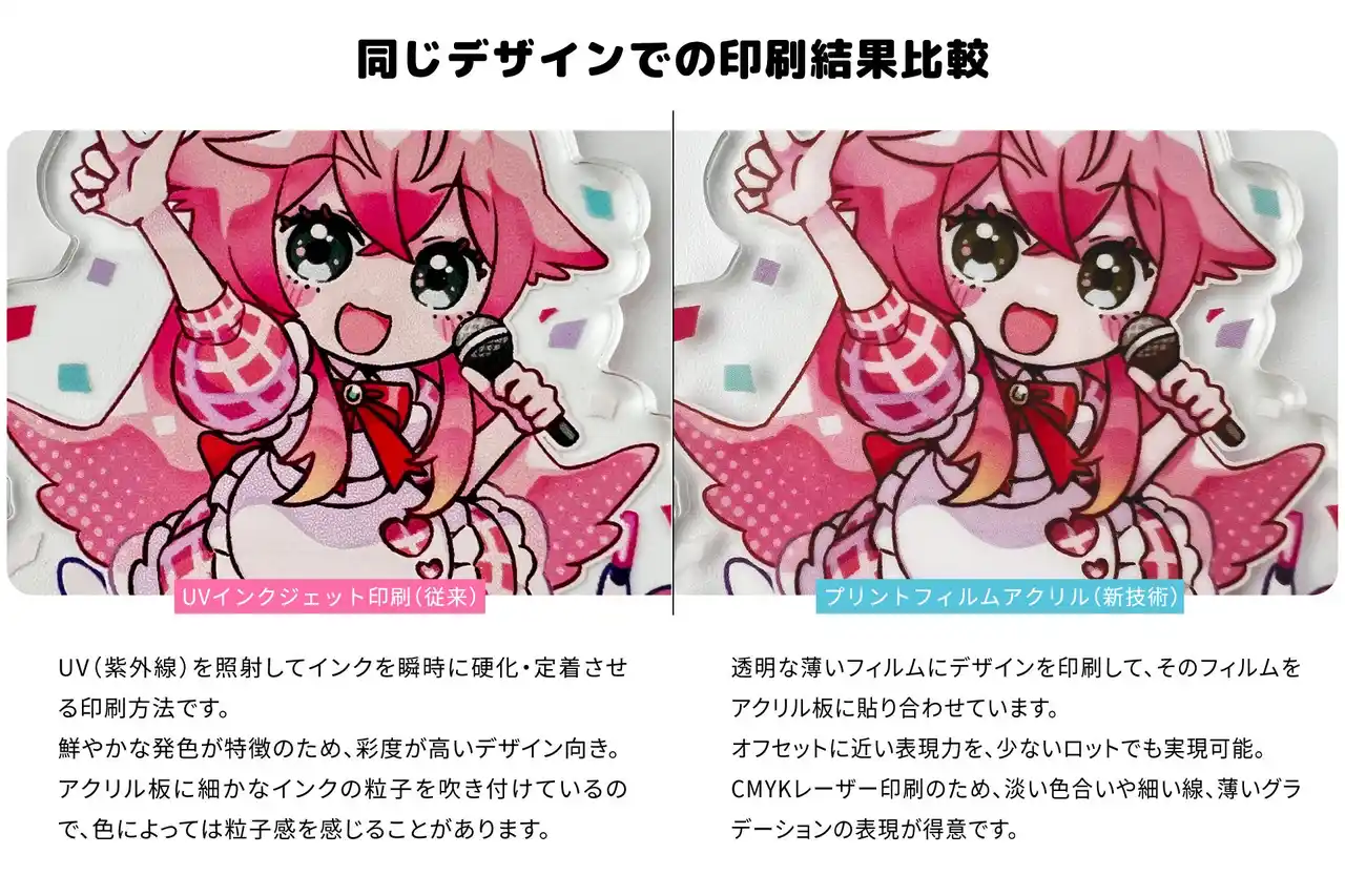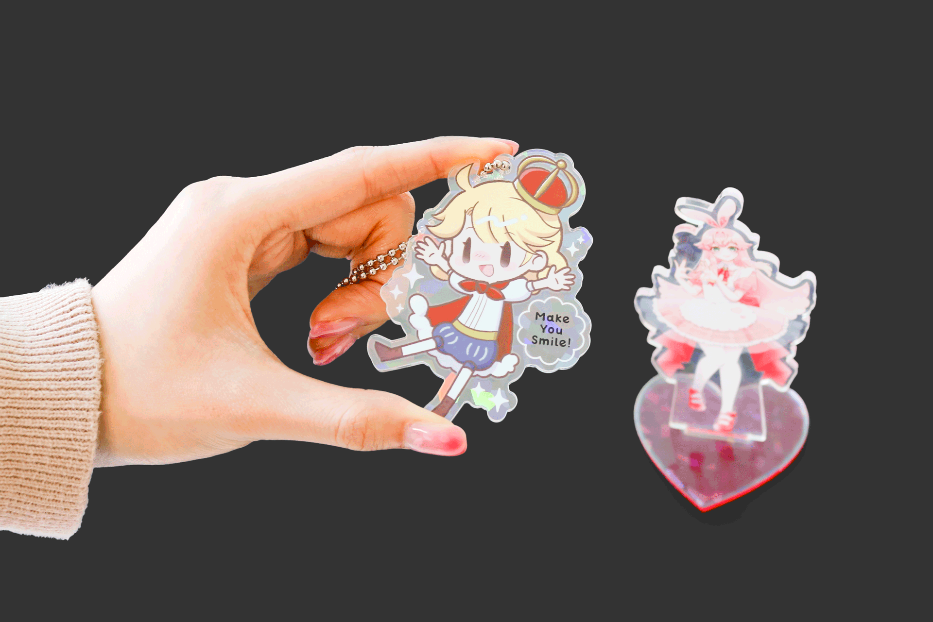 アクリルキーホルダーやアクリルスタンドを中心としたオリジナルグッズ市場は、近年、より高いクオリティを求めるクリエイター・企業のニーズが増えています。その中で、海外ではオフセット印刷+表面保護のクリアフィルムが主流となり、色鮮やかさとディテール再現性、高耐久性が高く評価されています。 |