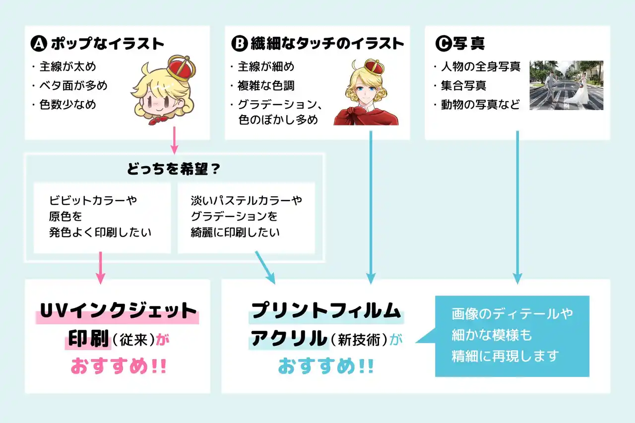 「プリントフィルムアクリル」発売を記念し、通常のアクリル仕様から「プリントフィルムアクリル」に無料アップグレード出来るキャンペーンを実施しています。 |