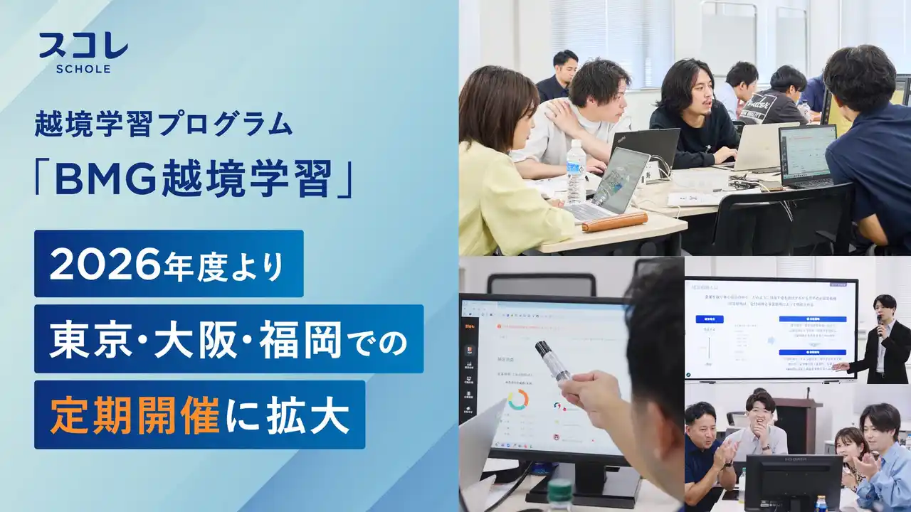次世代リーダーの育成に取り組むスコレ株式会社(本社:東京都新宿区、代表取締役社長:須藤 奨、以下「スコレ」)は、早稲田大学ビジネススクール(MBA)監修の経営シミュレーション「BMG」を活用した合同研修プログラム「BMG越境学習」について、2025年度に東京・大阪・福岡の全国3都市で計5回・ロート製薬・三菱マテリアル・スターフライヤーなど20社以上が参加し、参加満足度98%を達成した結果を受け、2026年度は年間7回の全国定期開催体制へ拡大することを発表します。 |