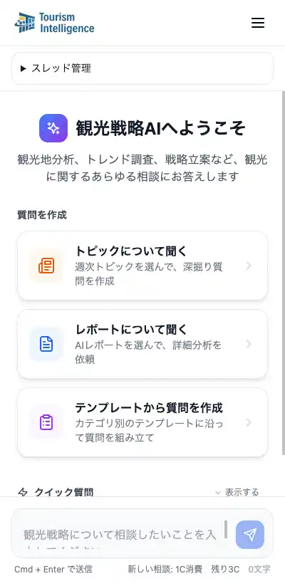 Tourism Intelligenceは、観光白書や47都道府県の観光振興計画データをもとに、AIが情報の整理・分析を行う観光戦略支援プラットフォームです。「AI相談」「テーマ別AIレポート」「週次トピック配信」の3つの機能を通じて、自治体やDMOの施策立案から日常の情報収集まで支援します。 |