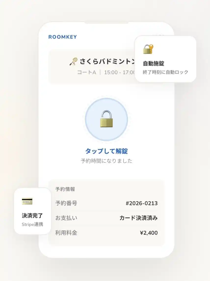 ROOMKEYは、予約・決済・スマートロック連携・売上管理を一元化し、施設の無人運営をシンプルに実現する無人運営プラットフォームです。 |