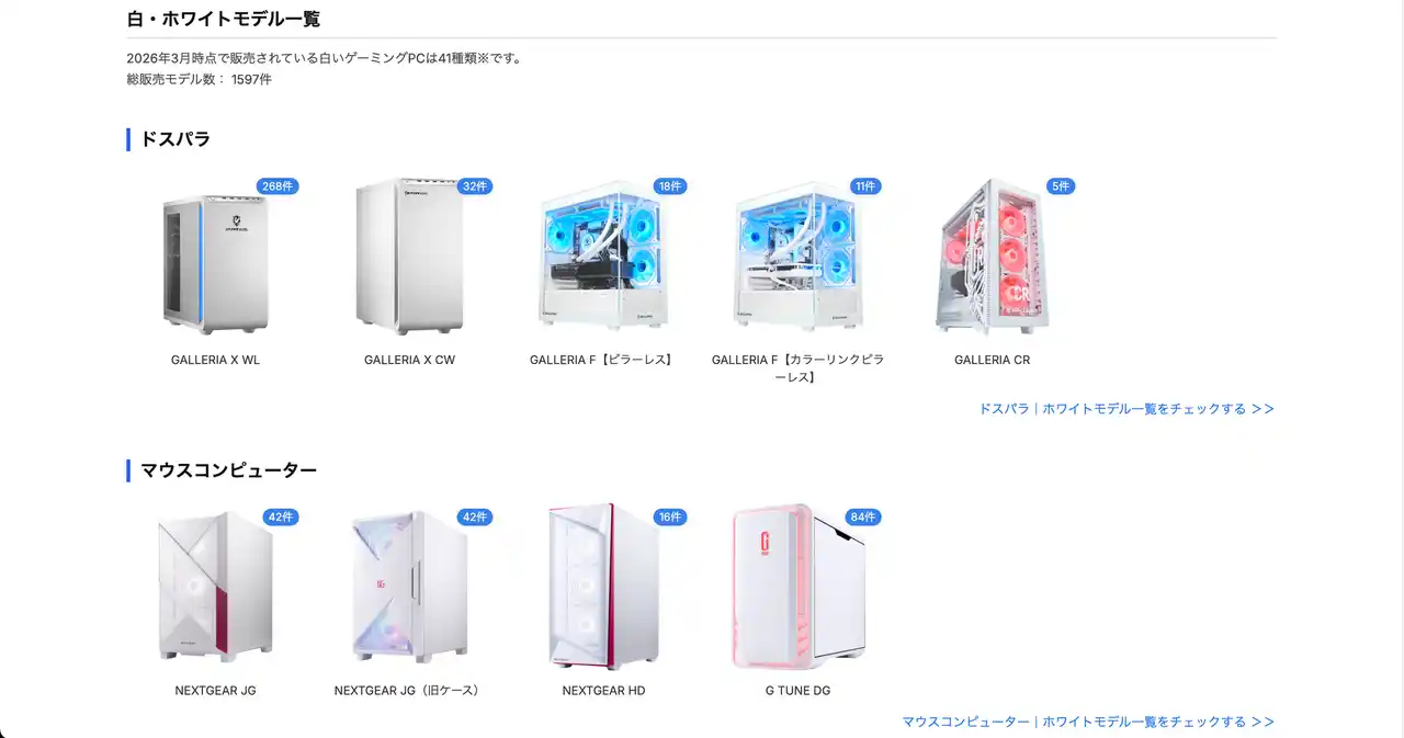 複数メーカーの白いゲーミングPCを、1ページ上でまとめて確認・比較しやすくなりました。