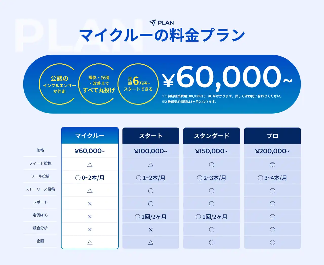 一般的な運用代行サービスの相場は、撮影込みで月額20万円前後が主流とされる中、月額60,000円という価格設定は、企業担当者目線でも導入ハードルが低く、「手が出しやすい」「まずは取り組んでみたい」という声を反映したものとなっています。 |
