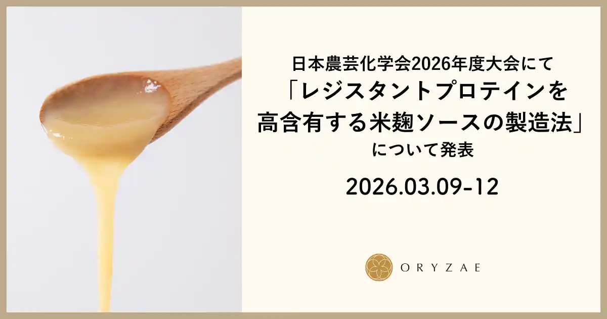 日本の伝統発酵技術を用いて社会課題解決を目指す株式会社オリゼ(本社:東京都渋谷区、代表取締役:小泉泰英)は、金沢工業大学(尾関健二教授)との共同研究成果を、2026年3月9日~12日に開催された「日本農芸化学会 2026年度大会」にて発表いたしました。本研究では、健康機能成分である「レジスタントプロテイン(RP)」を高含有する米麹ソースの製造プロセスにおいて、前処理の最適化と食塩(NaCl)添加による酵素活性の効率化を実現し、生産性と付加価値を同時に高める新たな製法を確立しました。