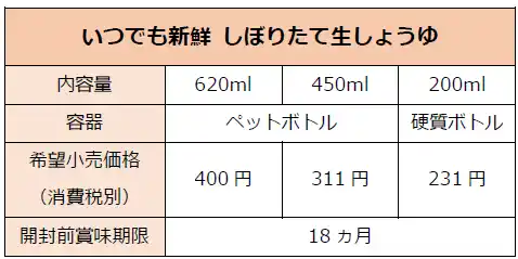 当社の「いつでも新鮮 しぼりたて生しょうゆ」(愛称“しぼ生”)は、生しょうゆならではのまろやかな旨みが特徴で、“しぼ生”だけで、しょうゆ1本で味つけしたとは思えないおいしさの料理を手軽につくることができます。 |