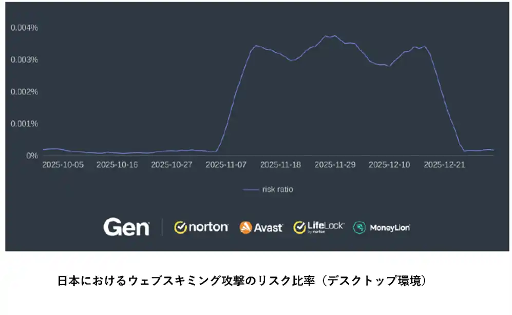 ノートンやアバストなどのブランドを擁し、信頼あるブランド群を擁するグローバル企業Genは、2025年第4四半期(2025年10月~12月)の「脅威レポート」を発表しました。2025年第4四半期における日本のサイバー犯罪リスク比率は20.01%に上昇し、第3四半期の17.50%から増加しました。詐欺やサイバー攻撃が複数の分野で引き続き増加していることから、脅威環境が一層深刻化していることが示されています。 |