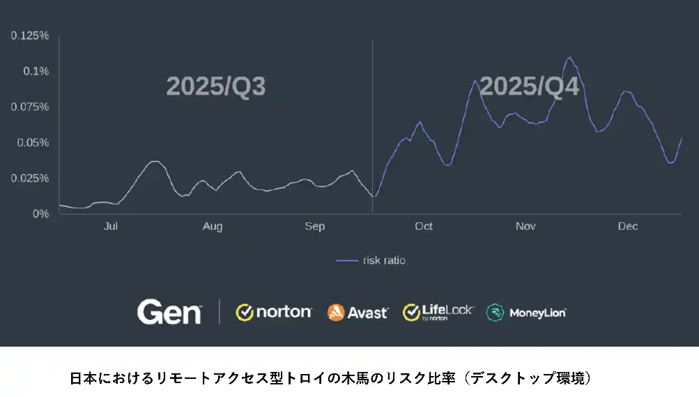 日本では、2025年第4四半期にデスクトップ環境におけるリモートアクセス型トロイの木馬(RAT)のリスク比率が前年同期比209.55%増加し、MRA(遠隔操作型マルウェア全般)も107.71%増加しました。さらに、日本全体のリスク比率は17.50%から20.01%へ上昇しており、脅威環境の悪化が確認されています。 |