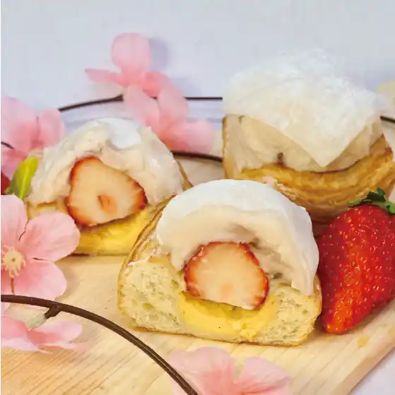 | B²のクロワッサン生地に、自家製桜カスタードを合わせて焼き上げた春限定デニッシュ。桜餡クリームとフレッシュいちご、求肥を合わせ、桜もちを思わせる味わいに仕上げました。 | |||||||||||||