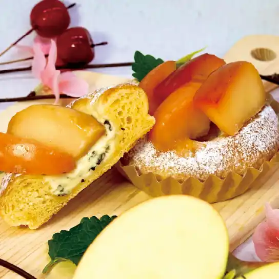 | しっとりとしたブリオッシュ生地に、レモンバーム・りんごピューレ・クリームチーズを合わせた自家製チーズクリームを絞り、りんごのコンポートをトッピング。 | |||||||||||||