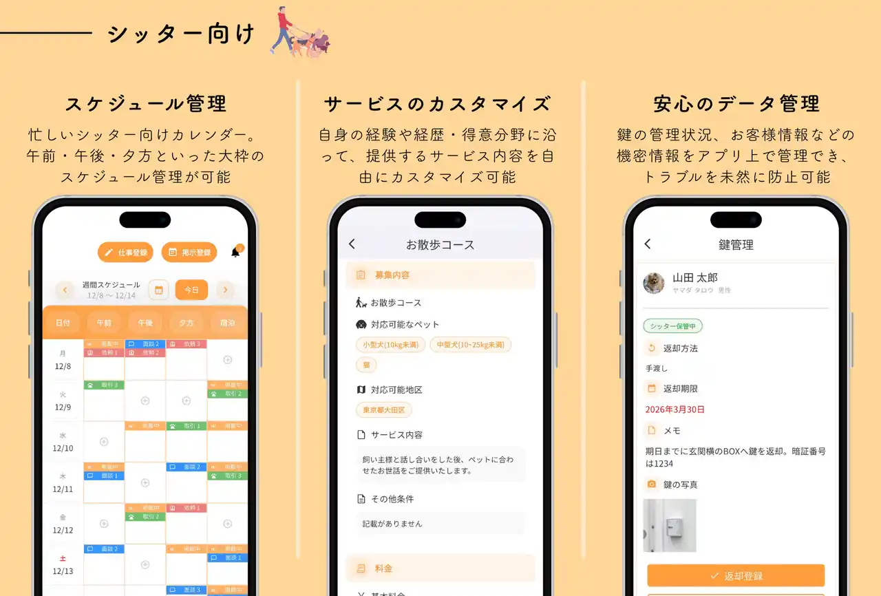 飼い主向け :シッター検索・予約、チャット、口コミ/評価、細かいペット情報の登録・共有 シッター向け:カレンダー、見積/請求、チャット、プロフィール設定、顧客データ管理 |
