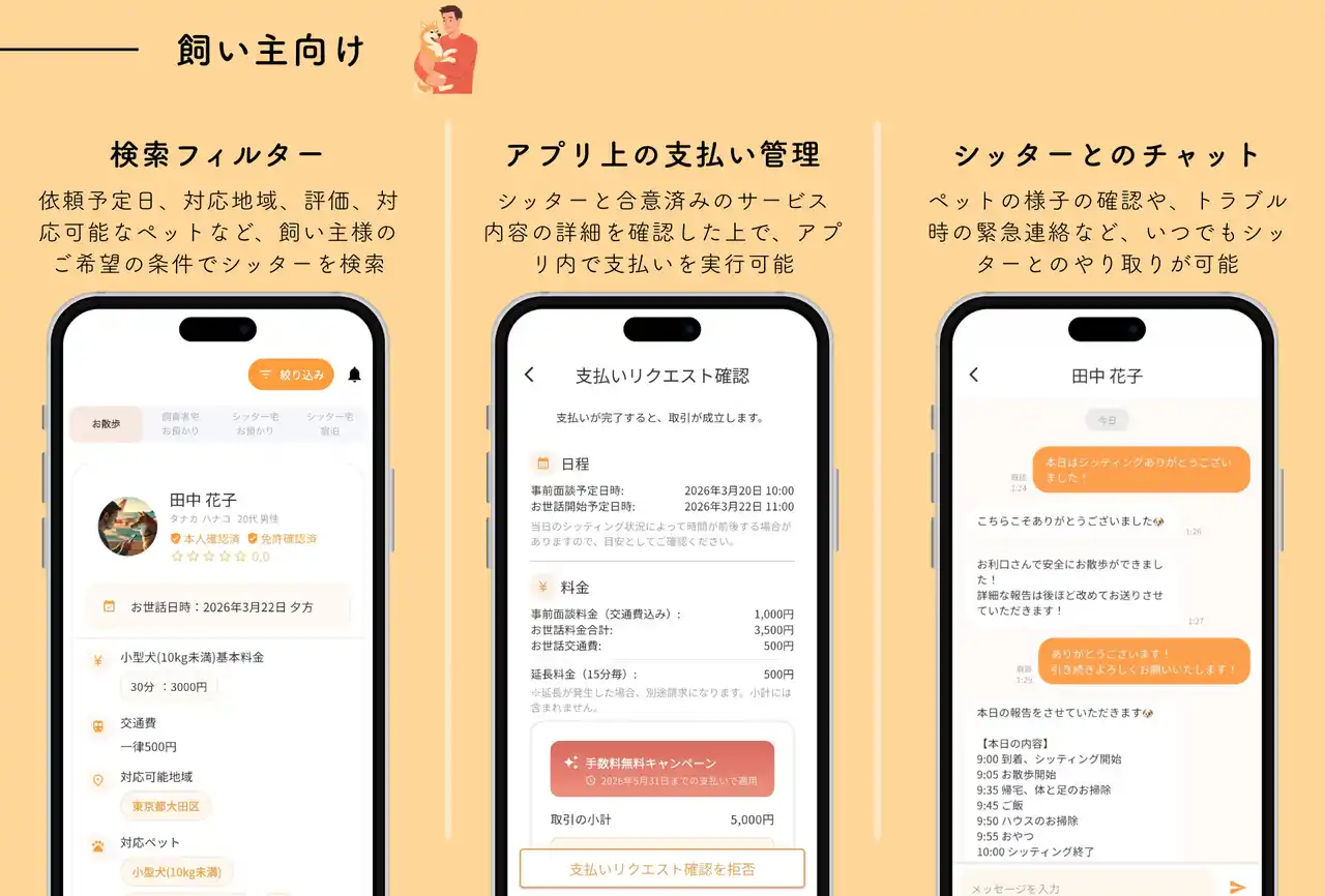 飼い主とシッター両者のマッチングから取引終了までをアプリ1つで完結。安心・安全な預け先の選択を支えます。 |