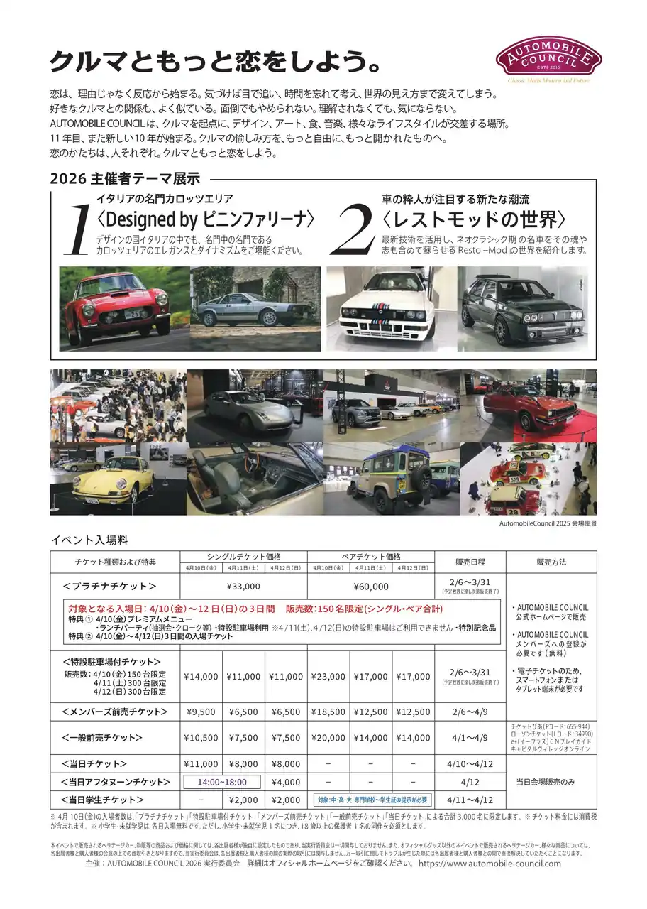 | オートモビルカウンシルは、「クルマを取り巻く文化」をテーマに開催される自動車カルチャーイベントです。クラシックカーやネオクラシックカーを中心とした車両展示のほか、メーカー・インポーターによる展示、ヘリテージカー販売店の出展などが行われます。 | |||