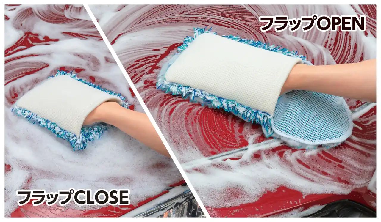 フラップを広げて使うことによりボンネット、ルーフなどの広い箇所もラクラク洗浄できます。また、フラップを収納することでフィット感の調整も可能です。 |
