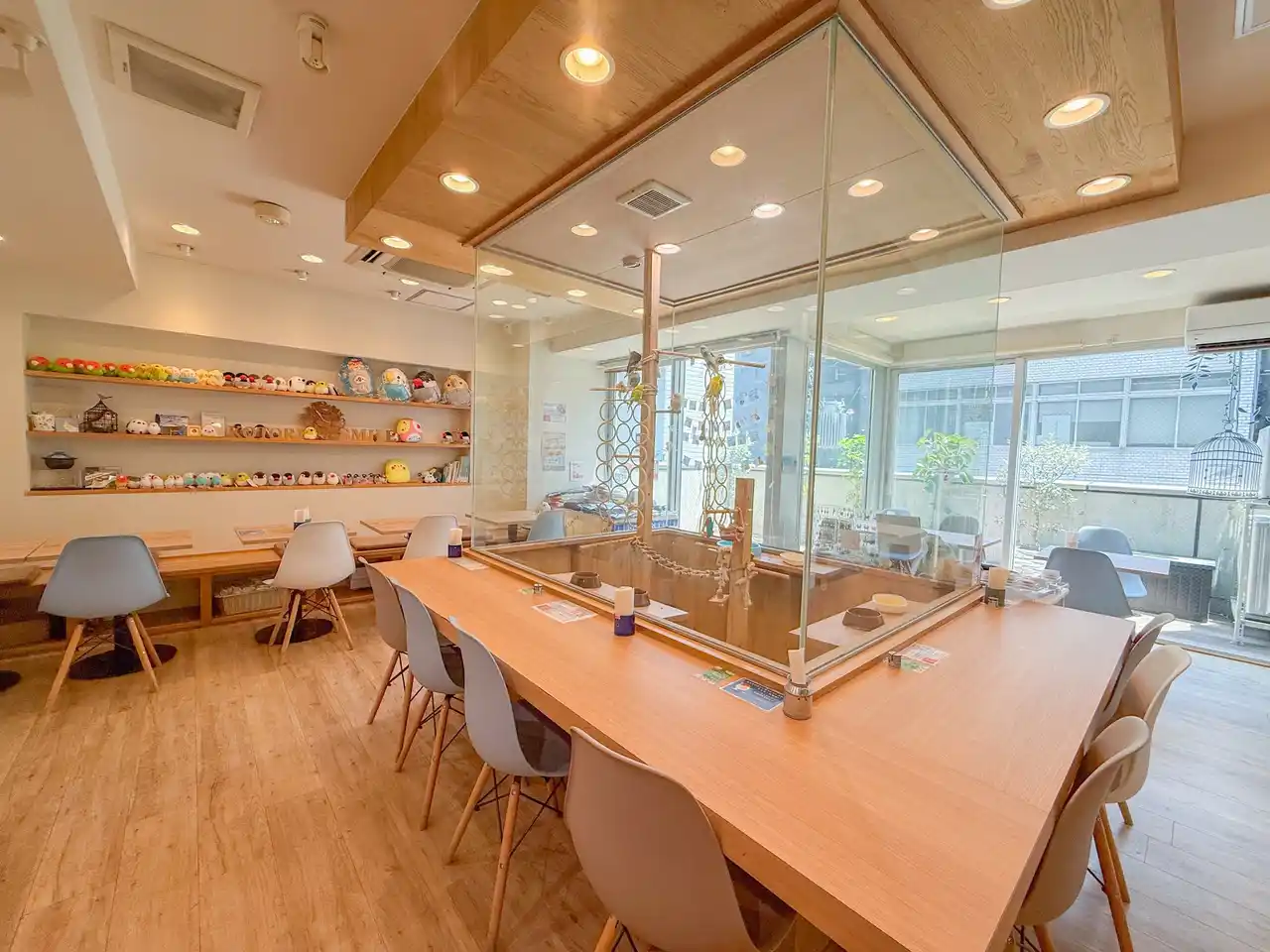 カフェと併設して鳥をモチーフにした雑貨コーナーもあり、品揃え豊富な鳥グッズを販売しております。衛生の都合上、鳥さんとの同伴や、放し飼いはしておりません。 |