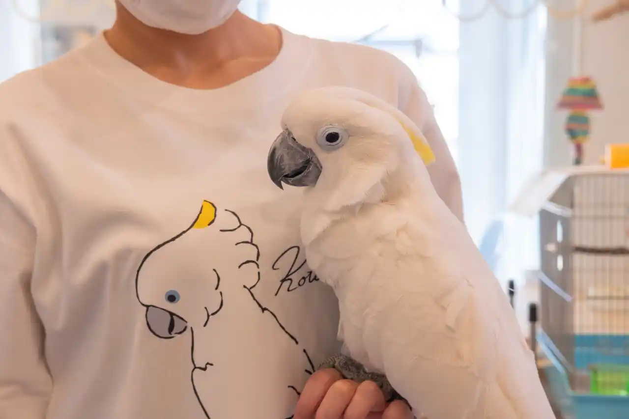 触れ合いスタッフのタイハクオウムとルリメタイハクオウムのハイブリッド「銀次郎(ぎんじろう)」愛称は、ぎんちゃん♪ ※触れ合い専用Tシャツは、「ことりすまいる」大阪/心斎橋の店頭だけで販売中♪ |