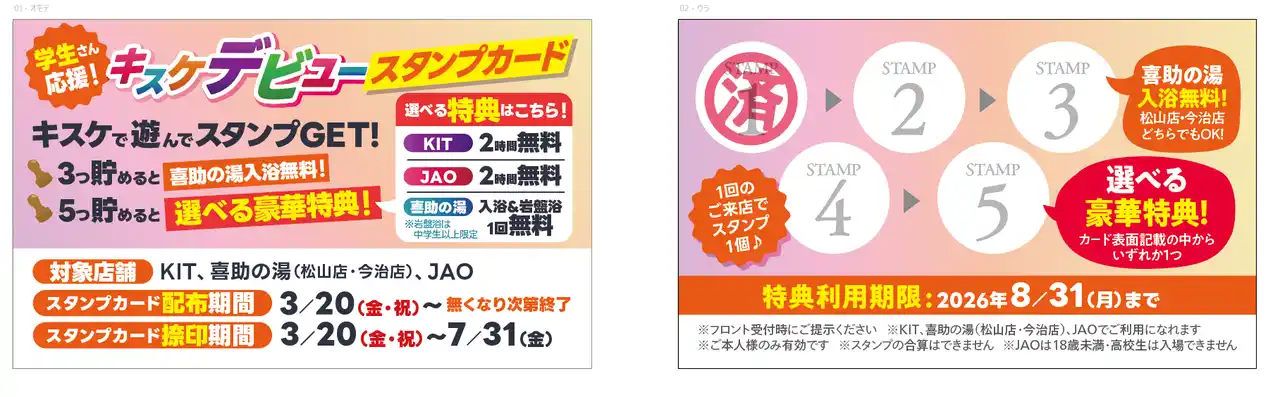 | キスケ株式会社(本社:愛媛県松山市)が運営するエンターテインメント複合施設「KISUKE BOX」では、小学生から大学生・専門学生までを対象とした学生応援企画「キスケデビュー スタンプラリーキャンペーン」を2026年3月20日(金・祝)より開催いたします。対象施設を利用するごとにスタンプを集めることで、温泉入浴や施設利用などの特典がもらえる参加型キャンペーンです。 | |||