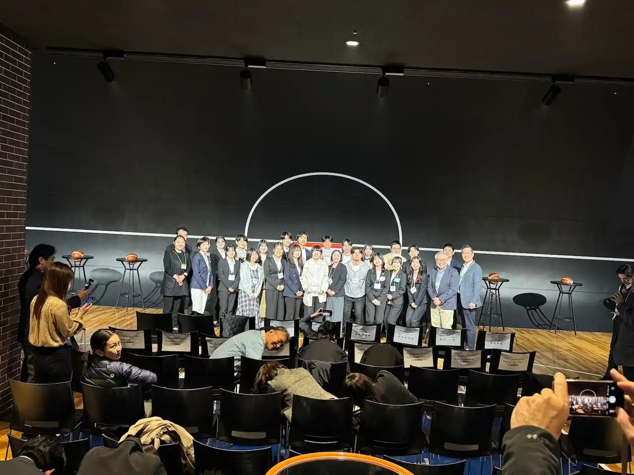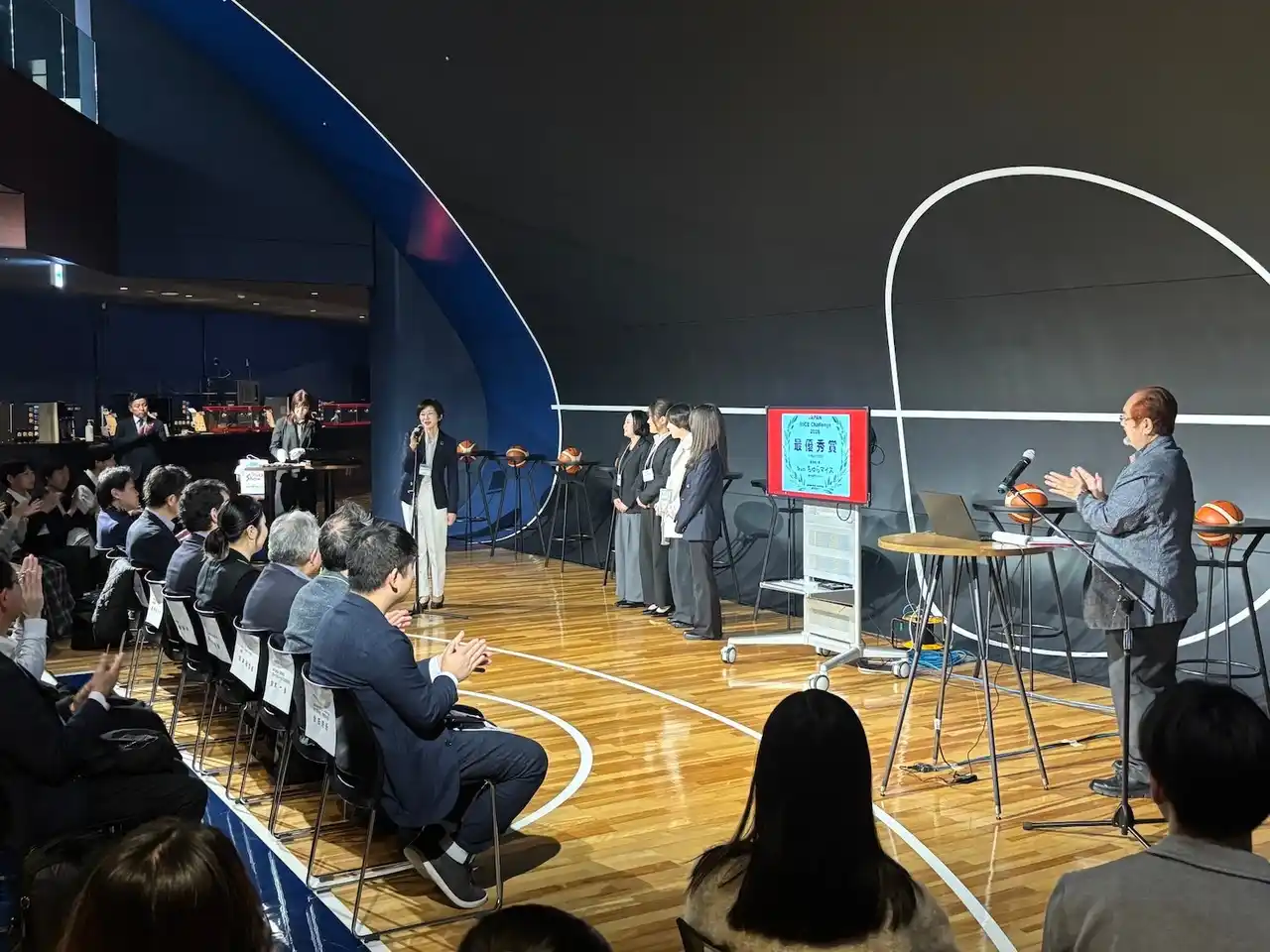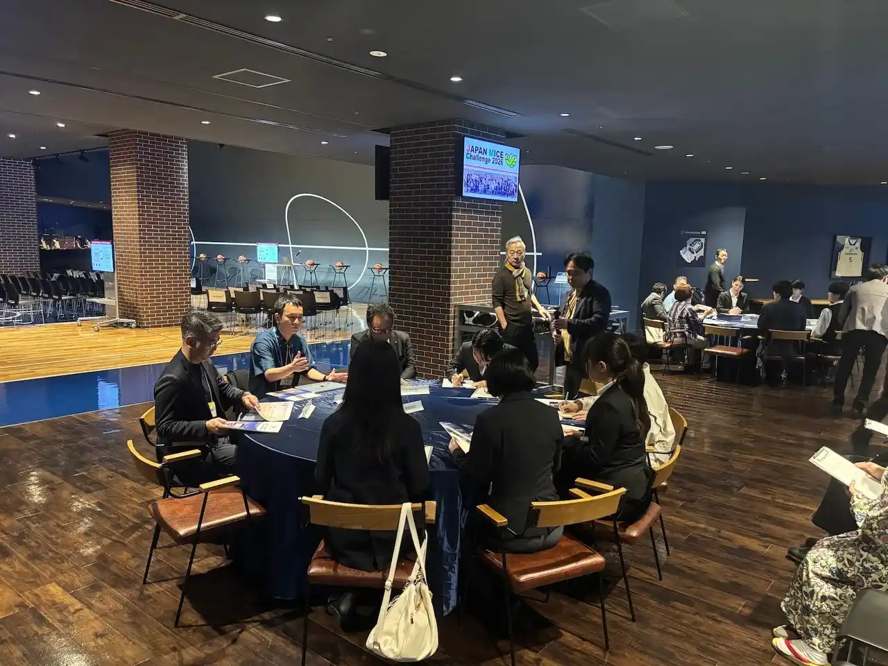 当日は、沖縄サントリーアリーナの施設機能を活用し、セミナーや交流プログラム、施設視察などを組み合わせた内容で実施されました。会場となった1Fコートサイドラウンジでは、ラウンジサイネージや移動式モニターを用いたプレゼンテーション環境を整備し、講演やディスカッションが行われました。 |
