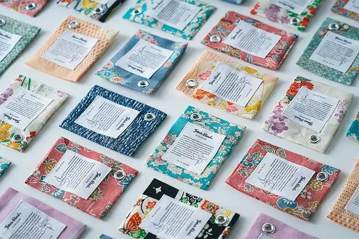 同じ反物でも裁断場所によってデザインや柄、風合いもすべて一点もの。一期一会のサシェ袋となっています。 |