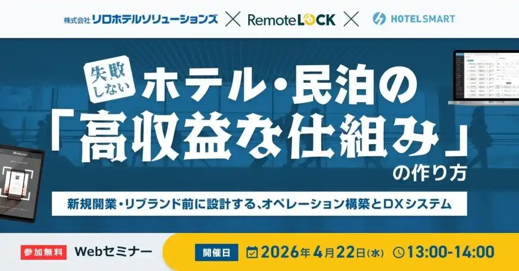 SMART>を提供する「xxx(エイジィ)株式会社」との3社共同で、2026年4月22日(水)「失敗しないホテル・民泊の“高収益な仕組み”の作り方」をテーマとした無料ウェビナーを開催します。 ウェビナー詳細:https://www.hotelsmart.jp/20260422-2/7815/ 株式会社リロホテルソリューションズ:https://relohotel-solutions.com/ |