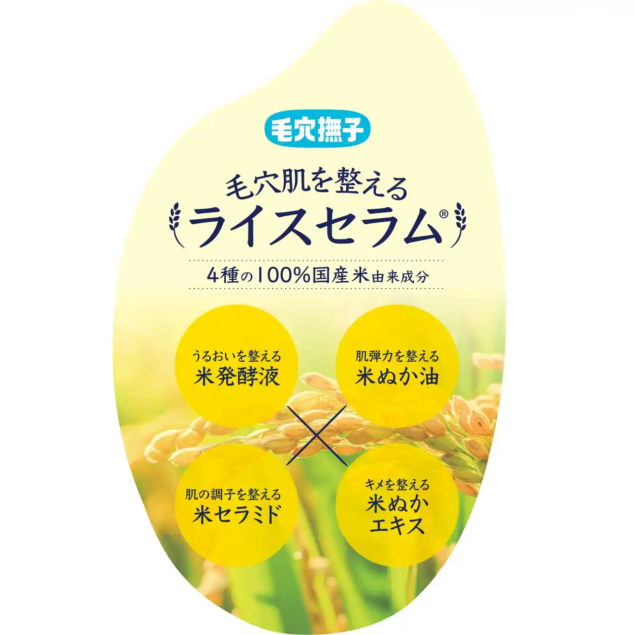 | 4種の100%国産米由来成分。乾燥によりぽっかり開いた⽑⽳肌を、ふっくらもっちりすべすべにさせる自然の恵みです。 | |||||||||||||