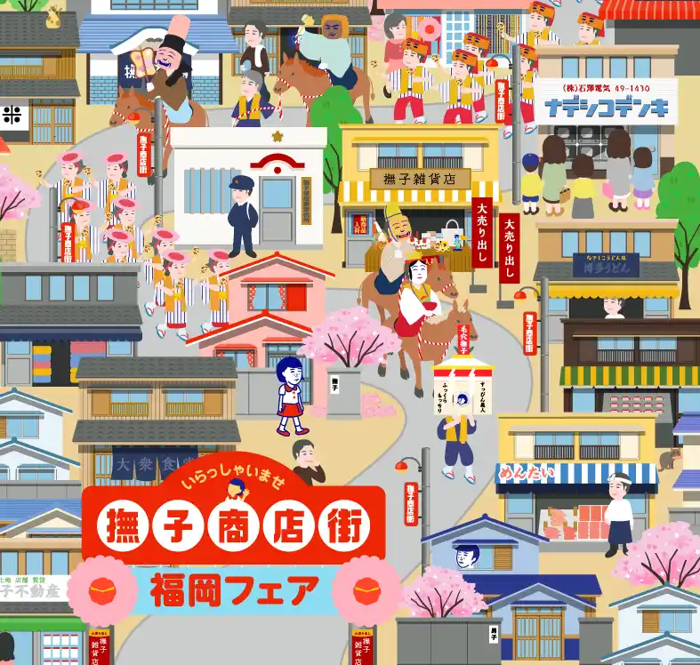 | 商店街は華やかな博多どんたくで賑わい、神社の露店には、明太子やあまおうなど福岡名物がずらり!あちこちよく見ると『ココも福岡!』というポイントがたくさん。巡っていると、気づけば福岡旅行気分に♪ | |||||||||||||