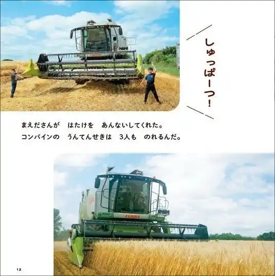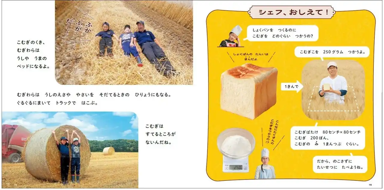 小麦粉は見たことがあっても、小麦はどんなふうに生えて、育つのか、知らない子どもたちも多くいます。この本では、地元の子どもたちが実際に小麦畑に行ってコンバインで収穫体験したり、麦わらに寝そべったりして、原料と触れ合います。 |