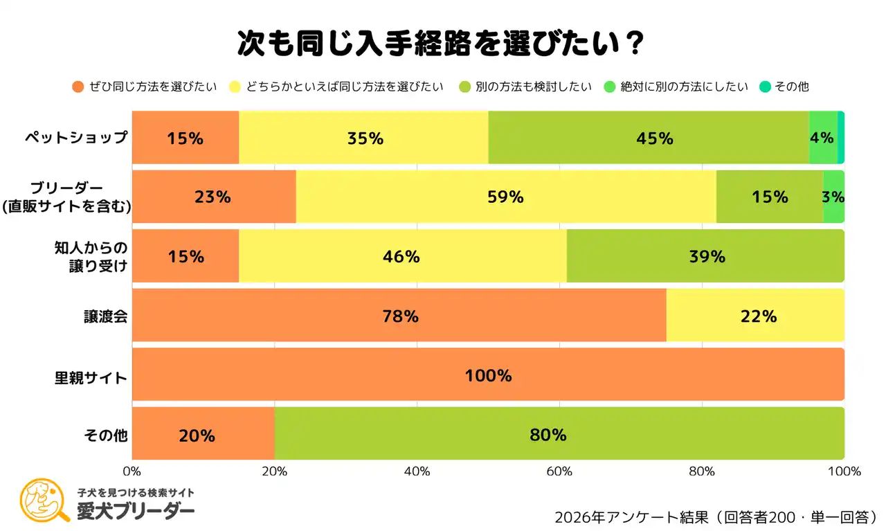 ◆ 譲渡会・里親サイトは100%、ブリーダー利用者は80%以上が「次も同じ経路」を希望。 |