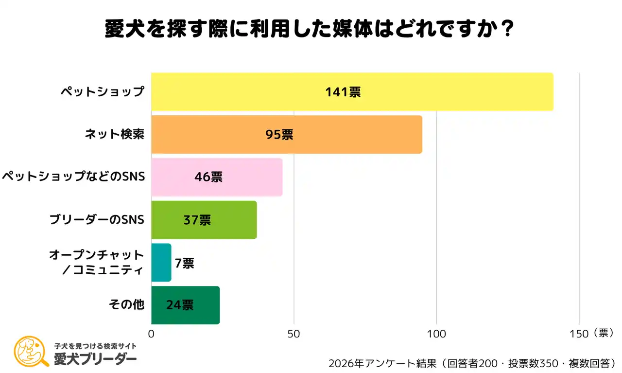 愛犬を探す際に参考にした媒体については、「ペットショップ(実際に店舗に行った/問い合わせた)」が141票(70.5%)で最多となり、直接足を運んで探すスタイルが根強いことがわかりました。 |