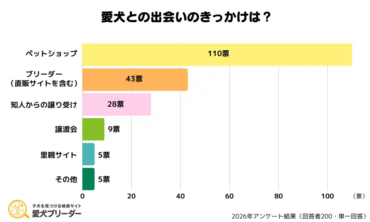 まず、愛犬との出会いのきっかけ(入手経路)を尋ねたところ、「ペットショップ」が110票(55%)で最多となりました。次いで「ブリーダー」が43票(21.5%)、「知人からの譲り受け」が28票(14%)と続いています。 |